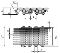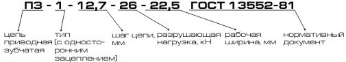 Приводные зубчатые цепи служат для передачи больших усилий с высокими (до 40 м/с) скоростями. Эти цепи подходят для скоростных металлообрабатывающих станков, текстильных машин, моторной транспортной техники. Засчет благоприятного угла зацепления и незначительных отдельных масс пластин возникает только слабый удар при входе в зацепление. Следствием этого является высокая плавность хода, а также точность вращения. При равных с приводными роликовыми цепями нагрузках зубчатые цепи имеют меньшие габариты. Цепи приводные зубчатые выпускаются по ГОСТ 13552-81 и по стандарту предприятия